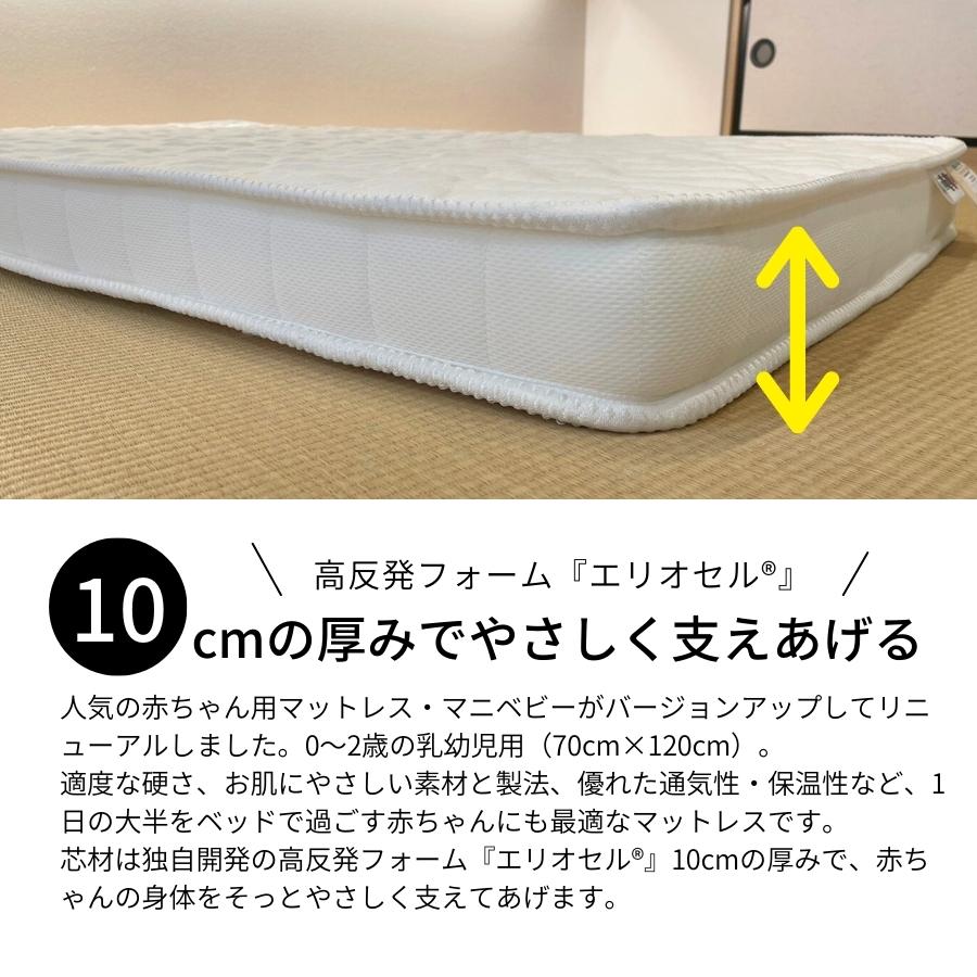 マニフレックスを代表する人気スタンダードモデル「モデル246」を、0〜2歳の乳幼児用にリサイズ(70cm×120cm)しました。適度な硬さ、お肌にやさしい素材と製法、優れた通気性・保温性など、一日の大半をベッドで過ごす赤ちゃんにも最適なマットレスです。