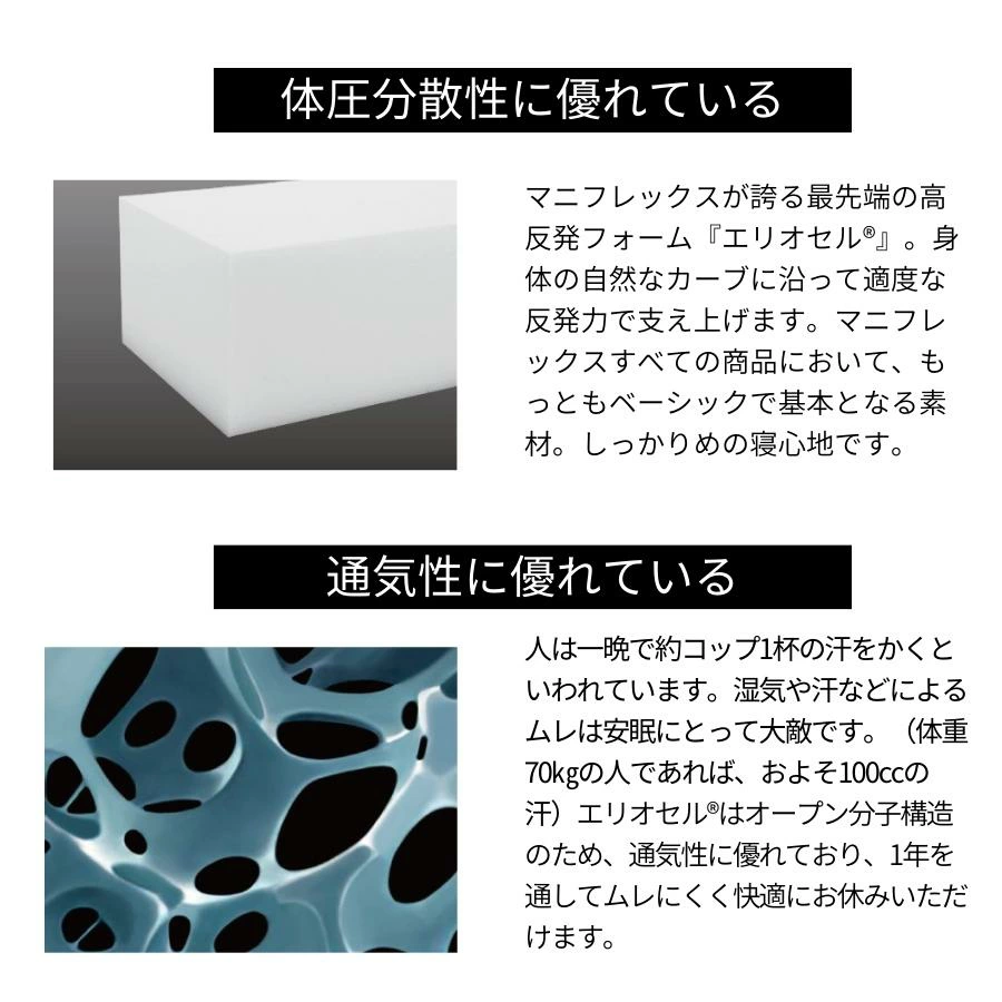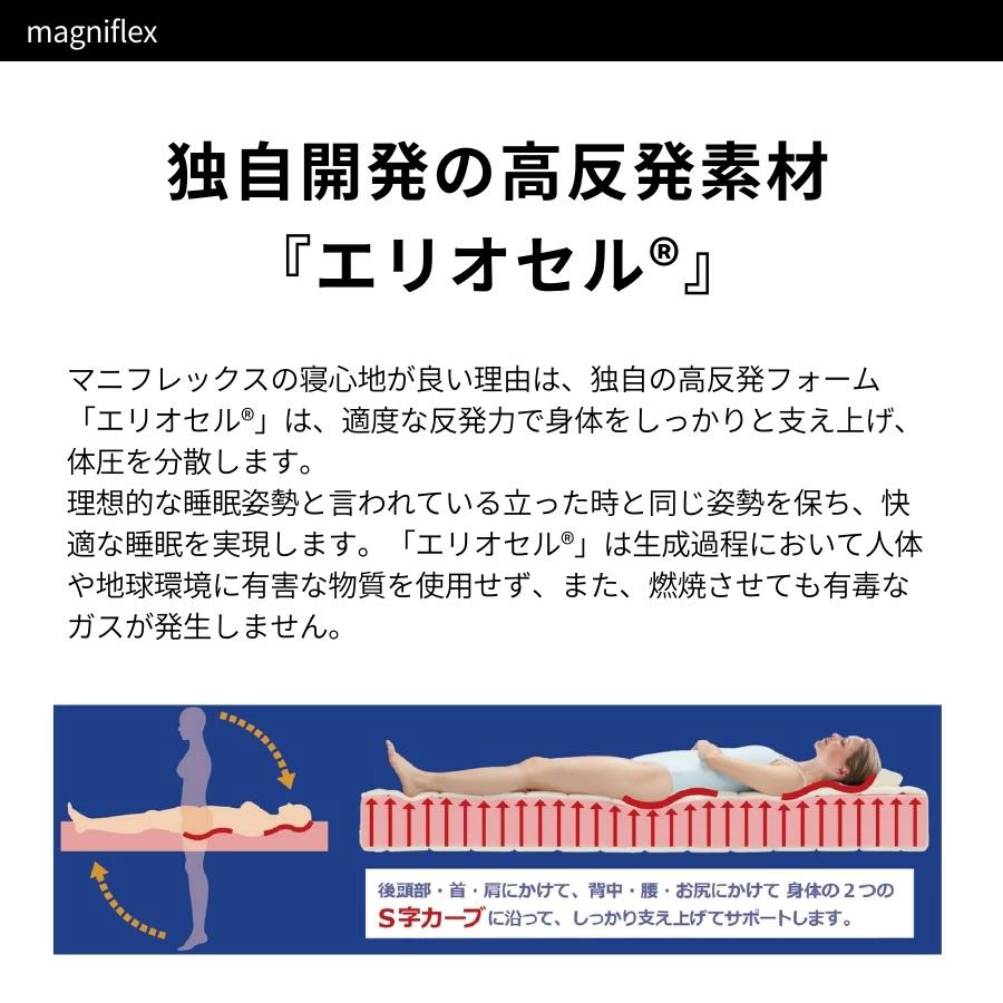 | マニフレックス特徴 | イタリア生まれの熟睡寝具、マニフレックスは、創業60年以上の歴史をもつ寝具ブランドで、世界99ヵ国以上に輸出され世界中の人たちに愛されています。 マニフレックスは、スプリングゼロ・プラスチックゼロ・有毒ガスゼロ・3つのゼロで人と地球にやさしい寝具です。 長年の研究の末に開発された「エリオセル」の構造が、スプリングやプラスチックを使用しなくても高反発性を備えることを可能にしました。 横たわると、背中・腰・お尻にかけての自然なカーブに沿って体全体を受け止め、適度な反発力でしっかりと支え上げます。 「エリオセル」は水を基に発泡させる次世代高反発フォームであり、生成過程においても人体や地球環境に有害な物質を使用せず、また、燃焼させても有毒なガスが発生しません。 「エリオセル」は温度変化に強く1年を通して変わらない寝心地でお休みいただけます。オープンセル分子構造で、まるで呼吸をするかのように通気性がよく、耐久性にも優れており、ドイツの検査機関「LGA GERMANY」の厳しい耐久性テストをクリアしています。 高反発と優れた耐久性・通気性を持った「エリオセル」だから、 真空ロールパッケージ が可能に。体積を1/8にまで圧縮することで、輸送コストだけでなく 温室効果ガスの大幅な削減 にも貢献しています。 |
