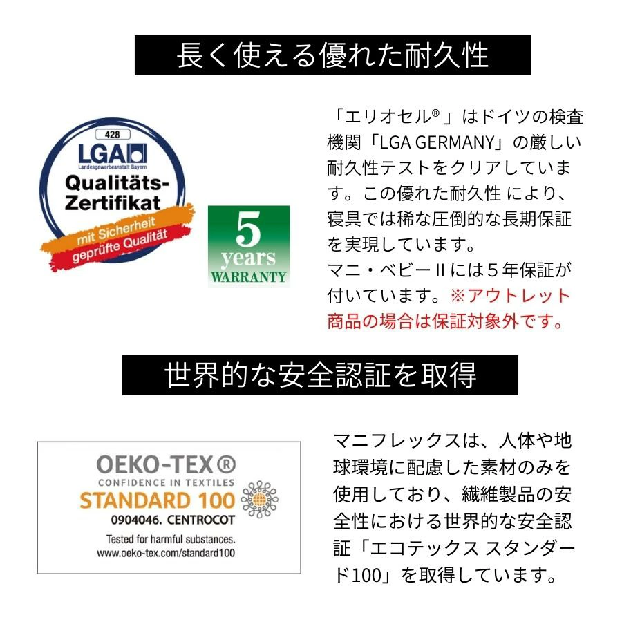 | 製品特徴 | マニフレックスを代表する人気スタンダードモデル「モデル246」を、0〜2歳の乳幼児用にリサイズ(70cm×120cm)しました。適度な硬さ、お肌にやさしい素材と製法、優れた通気性・保温性など、一日の大半をベッドで過ごす赤ちゃんにも最適なマットレスです。 芯材はしっかり硬めの「エリオセル」を採用しているので寝返りを打っても口元をふさぐ心配も少なく安心です。(一般的に乳幼児は骨格や筋肉が未発達のため、硬さのあるマットレス良いとされています。)※本製品は、水洗いできません。 |