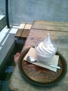 宮の下駅前のナラヤカフェで足湯につかりながら食べたソフトクリーム