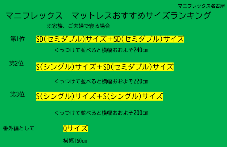 マニフレックス名古屋のスタッフも、家族それぞれがS(シングル)サイズやSD(セミダブル)サイズだったり