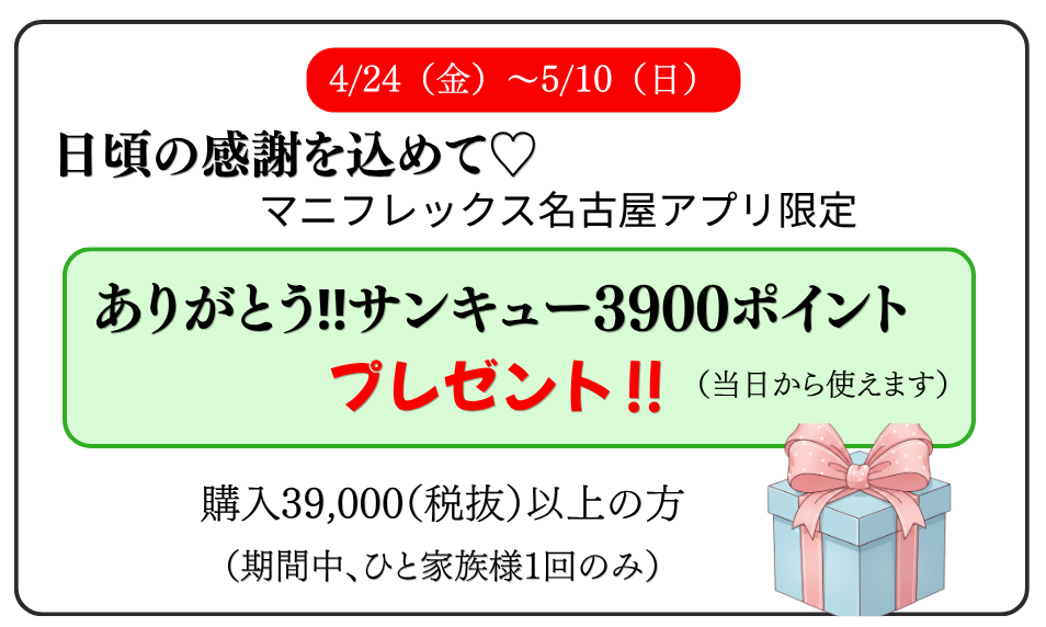 ※マニフレックス名古屋アプリ限定。ご購入39,000円(税抜)以上(期間中ひと家族様1回限り)
