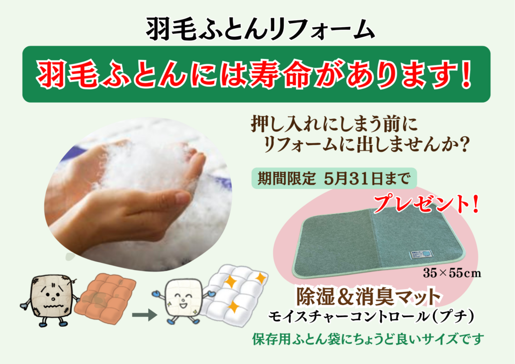 ❺「羽毛ふとんリフォーム」ご依頼の方に消臭&除湿マット(プチ)をプレゼント!
